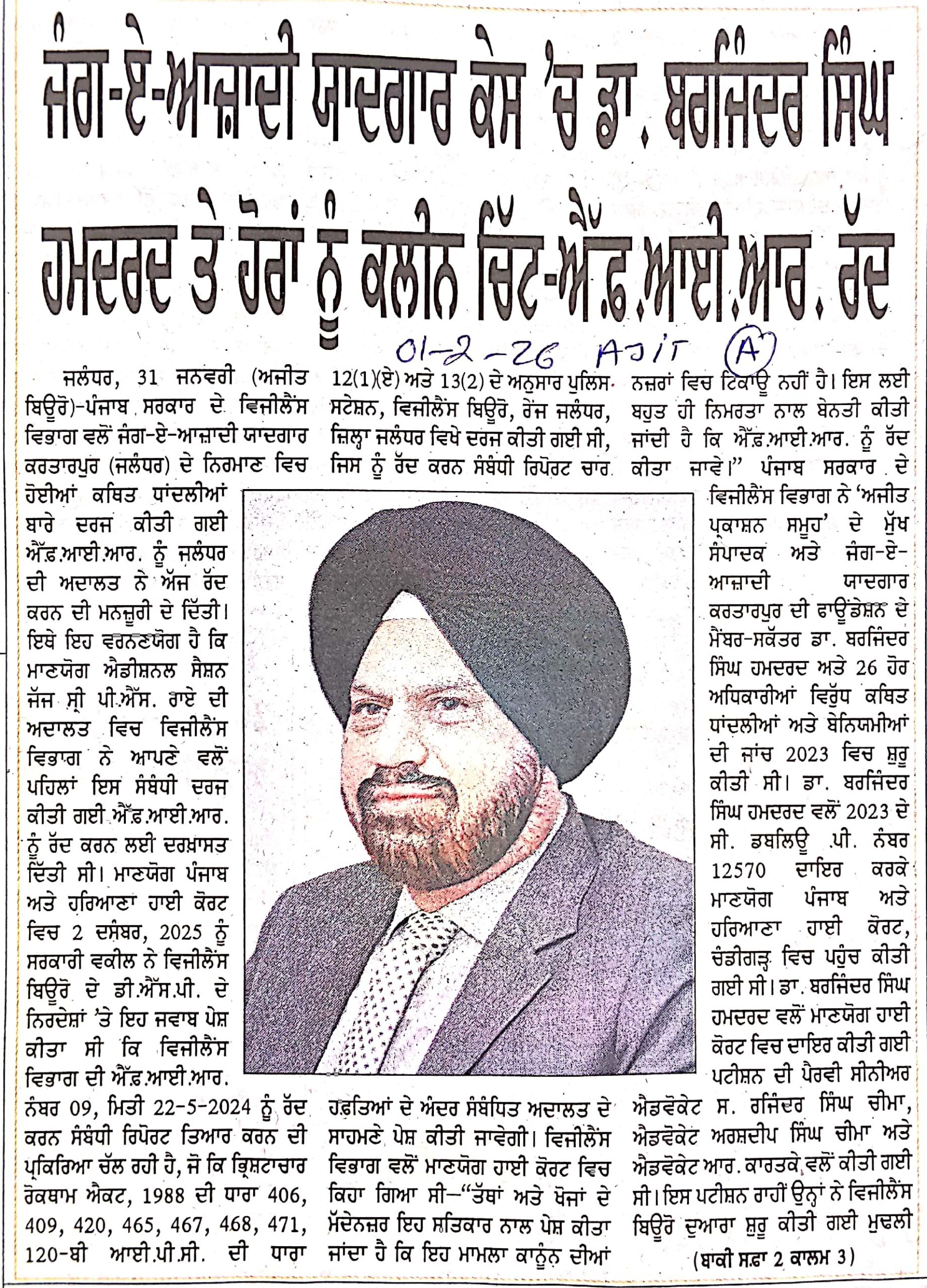 01/02/2026 Ajit/ Send By Charanjit ਜੰਗ-ਏ-ਆਜ਼ਾਦੀ ਯਾਦਗਾਰ ਕੇਸ 'ਚ ਡਾ. ਬਰਜਿੰਦਰ ਸਿੰਘ ਹਮਦਰਦ ਤੇ ਹੋਰਾਂ ਨੂੰ ਕਲੀਨ ਚਿੱਟ-ਐੱਫ਼.ਆਈ.ਆਰ. ਰੱਦ