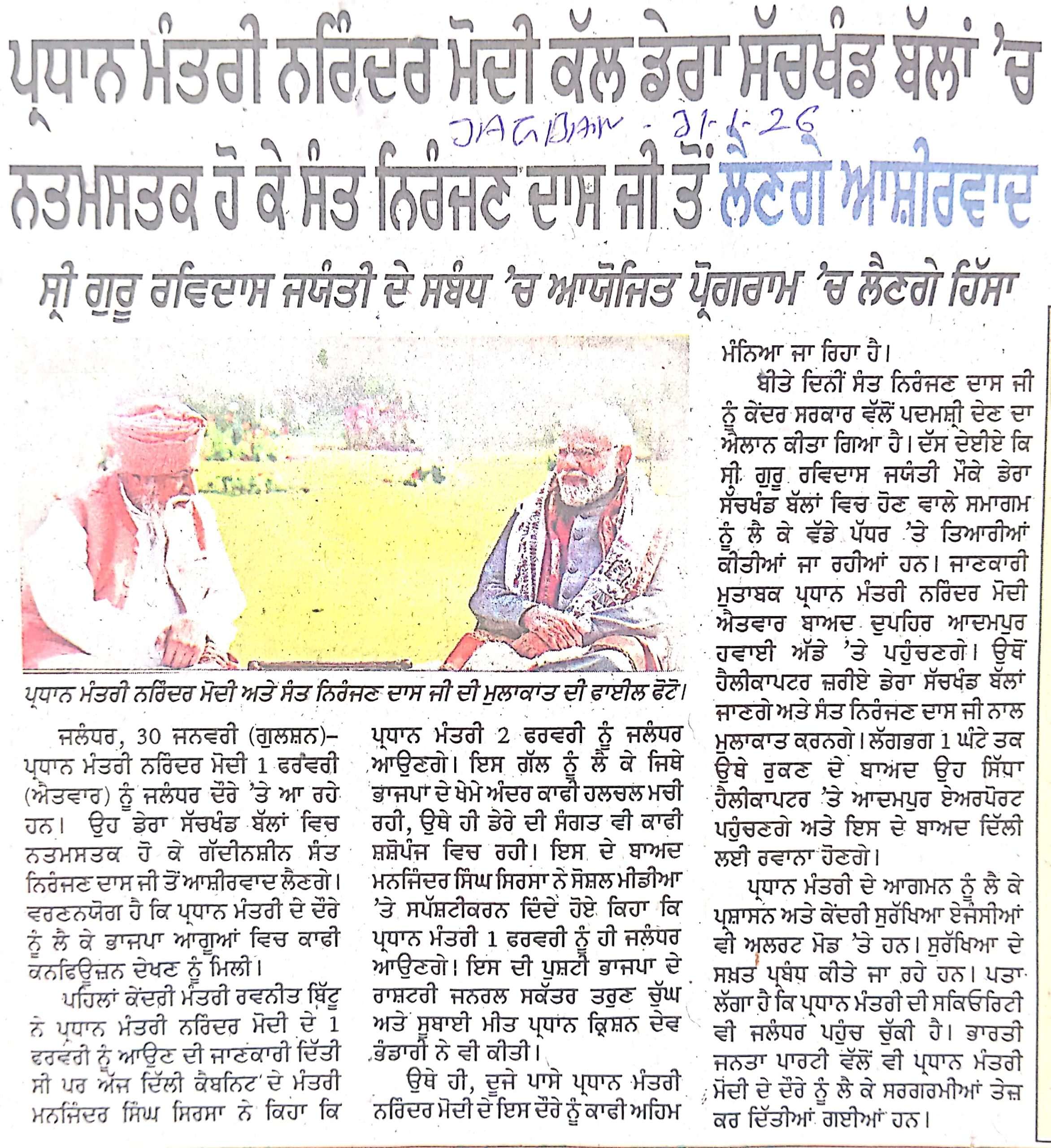 03/02/2026 Daily Ajit/ Send By Charanjit ਪ੍ਰਧਾਨ ਮੰਤਰੀ ਨਰਿੰਦਰ ਮੋਦੀ ਕੱਲ ਡੇਰਾ ਸੱਚਖੰਡ ਬੱਲਾਂ 'ਚ ਨਤਮਸਤਕ ਹੋ ਕੇ ਸੰਤ ਨਿਰੰਜਣ ਦਾਸ ਜੀ ਤੋਂ ਲੈਣਗੇ ਆਸ਼ੀਰਵਾਦ