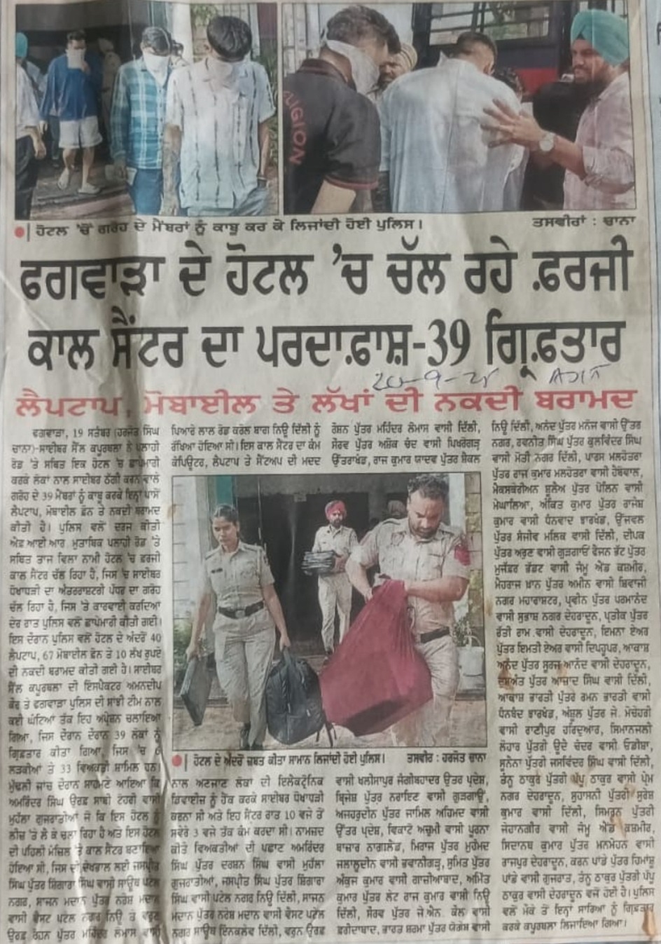 Daily Ajit 20/09/2025 Send By: Charanjit Singh ਫਗਵਾੜਾ ਦੇ ਹੋਟਲ 'ਚ ਚੱਲ ਰਹੇ ਫਰਜੀ ਕਾਲ ਸੈਂਟਰ ਦਾ ਪਰਦਾਫ਼ਾਸ਼ - 39 ਗਿਫ਼ਤਾਰ