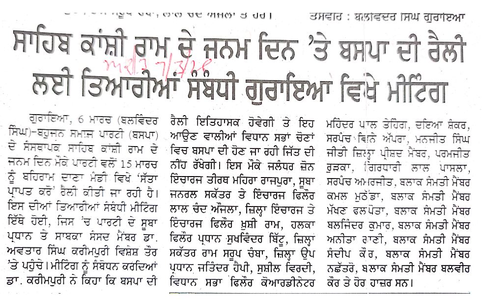 07/03/2026 Ajit/ Send By Charanjit ਸਾਹਿਬ ਕਾਂਸ਼ੀ ਰਾਮ ਦੇ ਜਨਮ ਦਿਨ ’ਤੇ ਬਸਪਾ ਦੀ ਰੈਲੀ ਲਈ ਤਿਆਰੀਆਂ ਸਬੰਧੀ ਗੁਰਾਇਆ ਵਿਖੇ ਮੀਟਿੰਗ